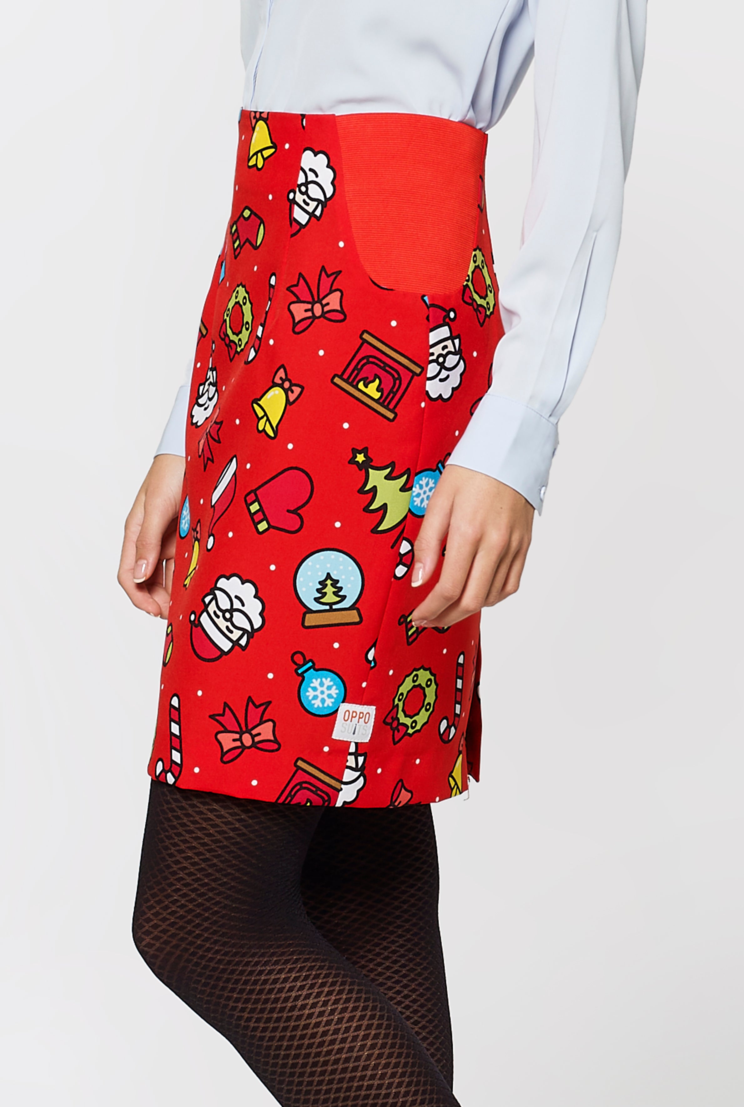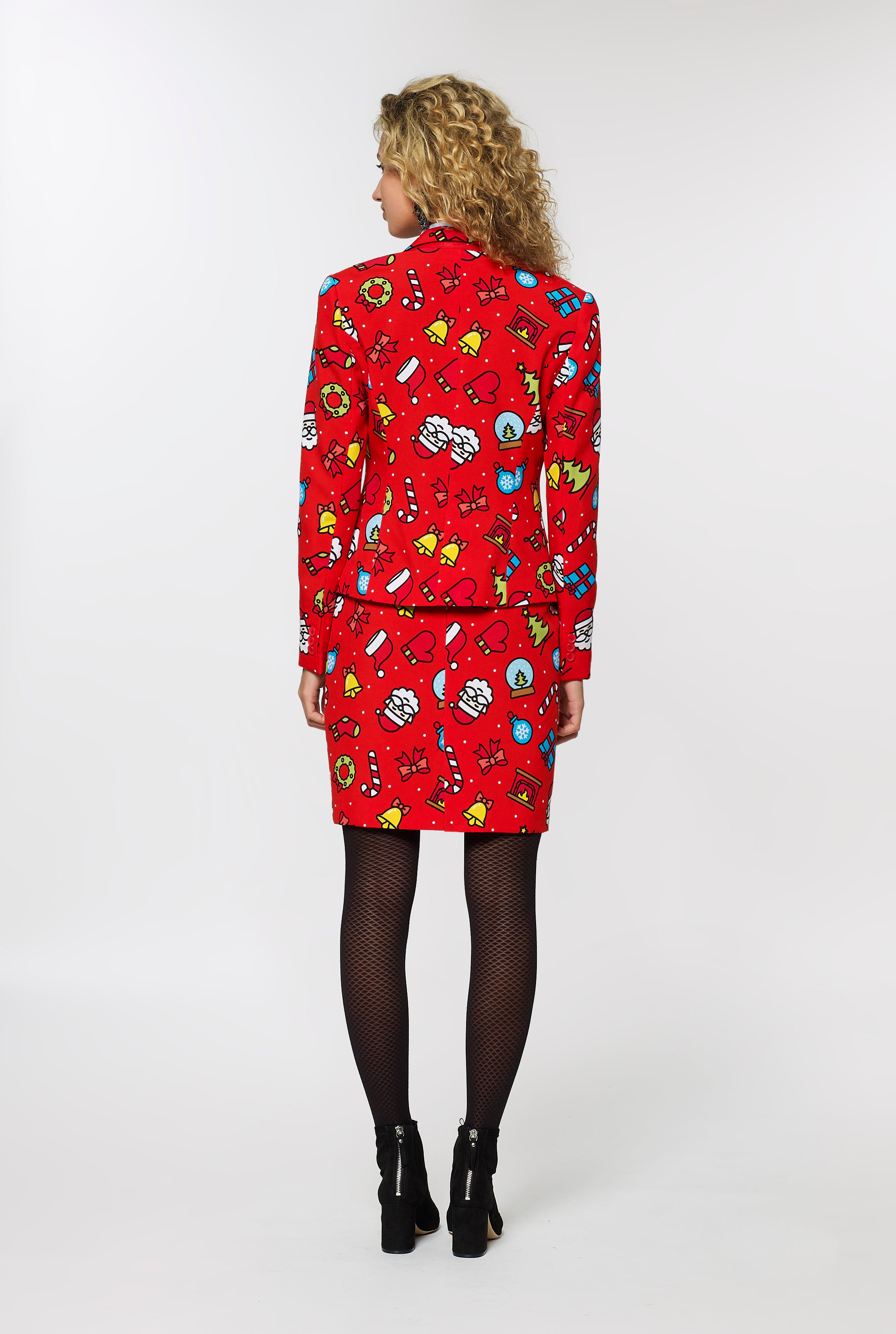 Set the holiday clothing standard by adding a fun touch to your formal look with this womenβs Christmas suit. It has all ingredients for a great Christmas; from candy canes to fireplaces. So, just wrap yourself in this festive outfit and instantly spread the Christmas spirit. Compliments guaranteed.
